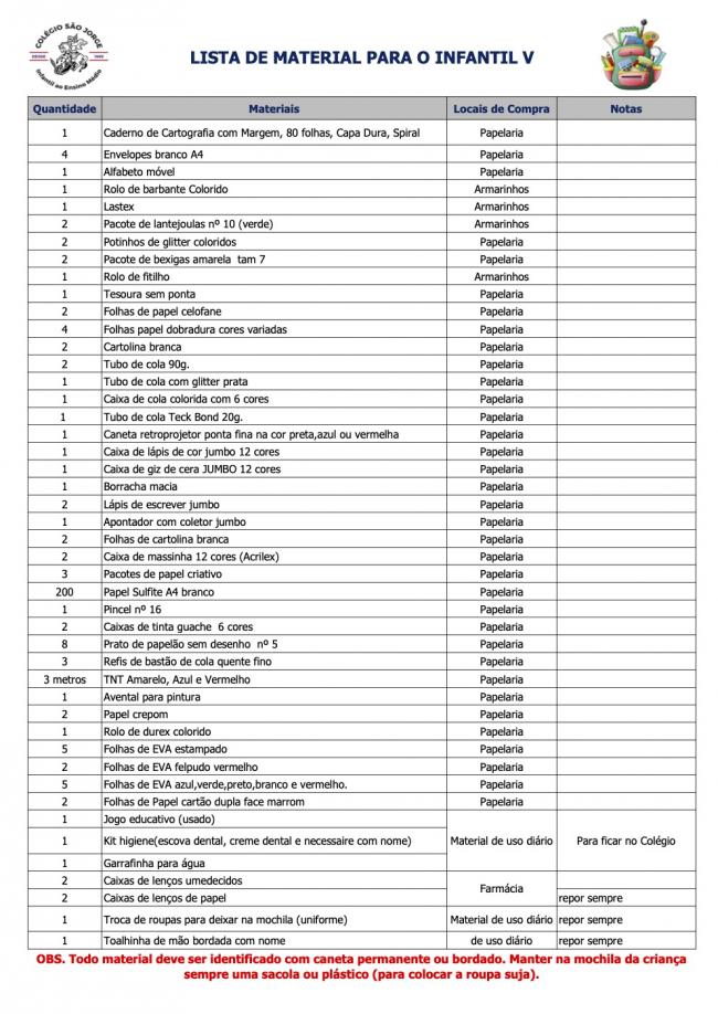 Lista de Material Infantil V