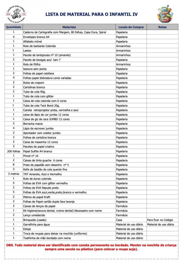 Lista de Material Infantil IV