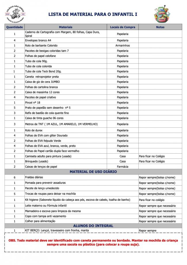 Lista de Material Infantil I
