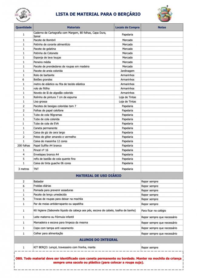 Lista de Material Berçario